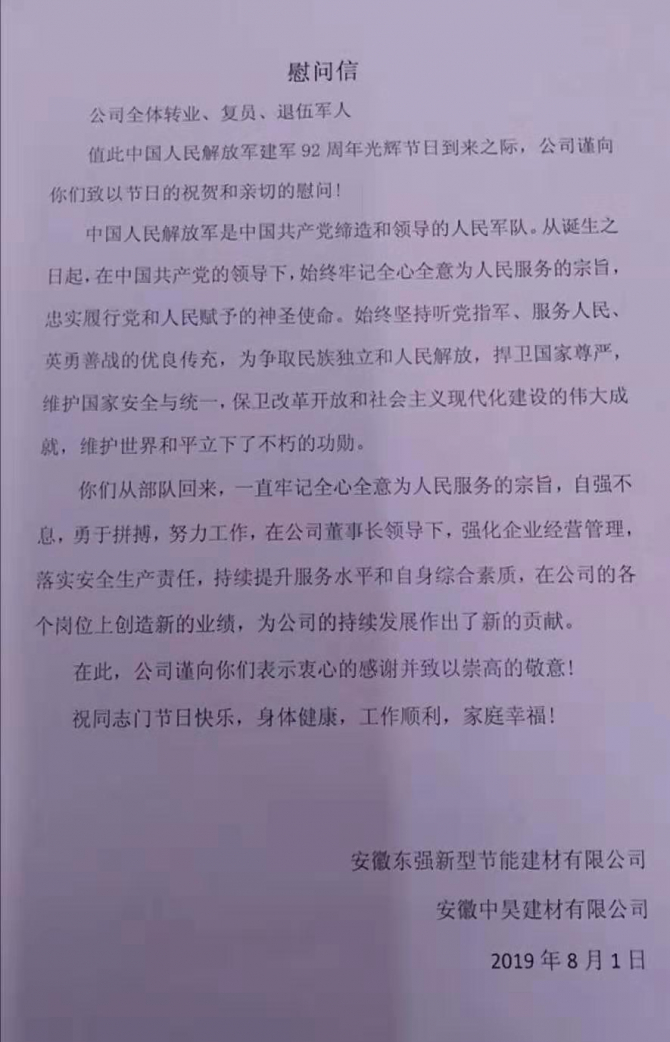 2019年8月1日迎來中國人民解放軍建軍92周年,公司全體領導、員工,向祖國最親愛的子弟兵致以衷心的祝福,同時向公司退伍軍人表達親切的慰問。