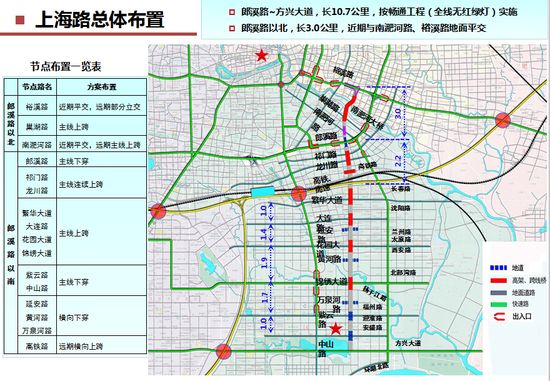 上海路暢通工程(郎溪路—方興大道)由中鐵十局承建,長(zhǎng)10.7公里,按暢通工程(全線無(wú)紅綠燈)實(shí)施;郎溪路以北至裕溪路,長(zhǎng)3.0公里,近期與南淝河路、裕溪路地面平交。巢湖路及南淝河大橋節(jié)點(diǎn):南淝河大橋主線跨過巢湖路落地,南淝河大橋采用下承式鋼桁架橋,橋面寬40米,雙向六車道,主跨130米。該項(xiàng)目主題結(jié)構(gòu)設(shè)計(jì)使用年限為100年,全部采用耐久性砼。