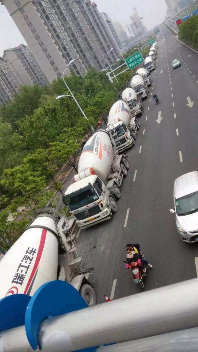 下圖為澆筑該項(xiàng)目主樓12000m3大體積同時(shí)現(xiàn)場(chǎng)等待的砼攪拌車。