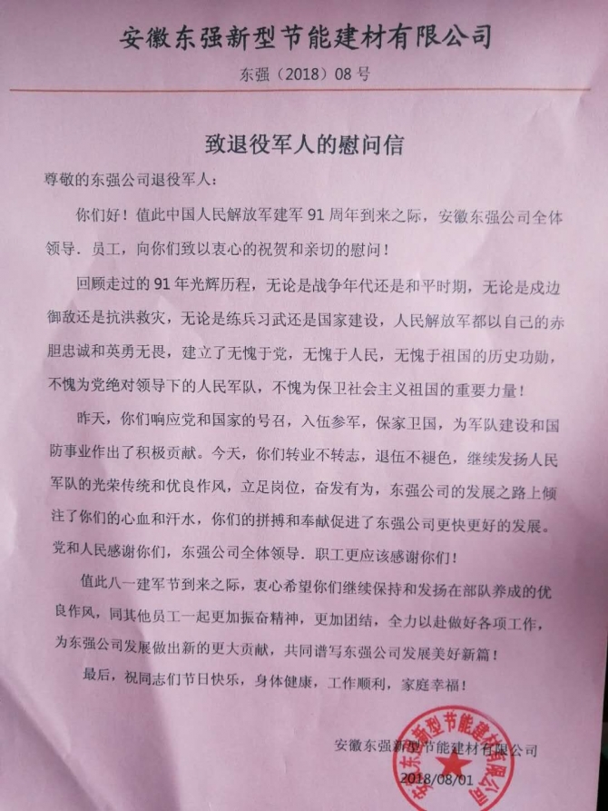 今天迎來中國人民解放軍建軍91周年,安徽東強(qiáng)公司全體領(lǐng)導(dǎo)、員工,向祖國最親愛的子弟兵致以衷心的祝福,同時(shí)向公司退伍軍人表達(dá)親切的慰問。